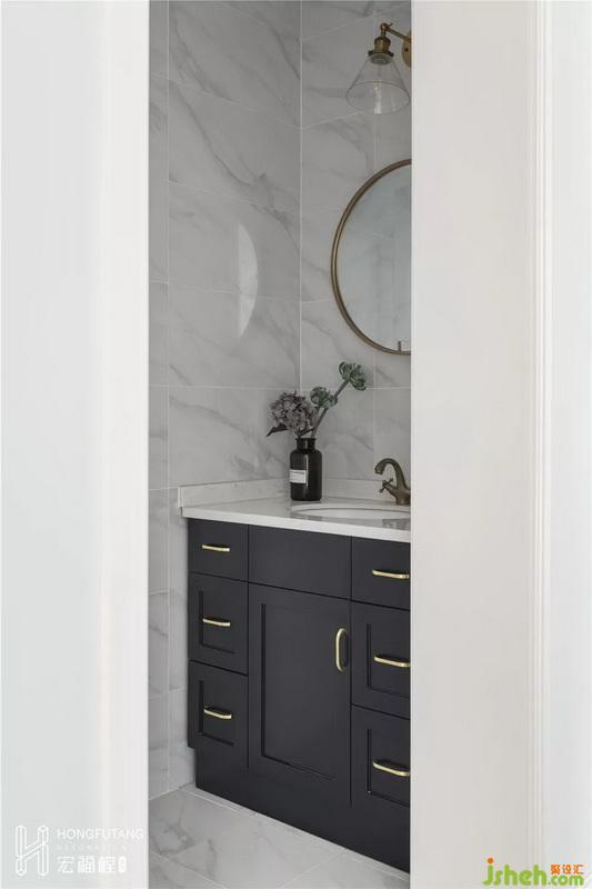 卫生间选用大理石瓷砖搭配黑色收纳柜,深色系便于清洁,抽屉式收纳柜利于分类使用,空间更加干净整洁。