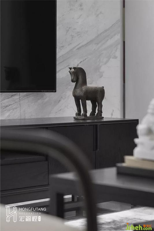 高级灰的采用会使得卧室空间清静稳重,烫金明黄等颜色作为软装出现,调和空间色彩,更显生机;床头、床头柜、壁画、灯具都选用黑色线条包边,让整个空间视觉呈现更加清晰,也满足中国古代条理有致的思维。