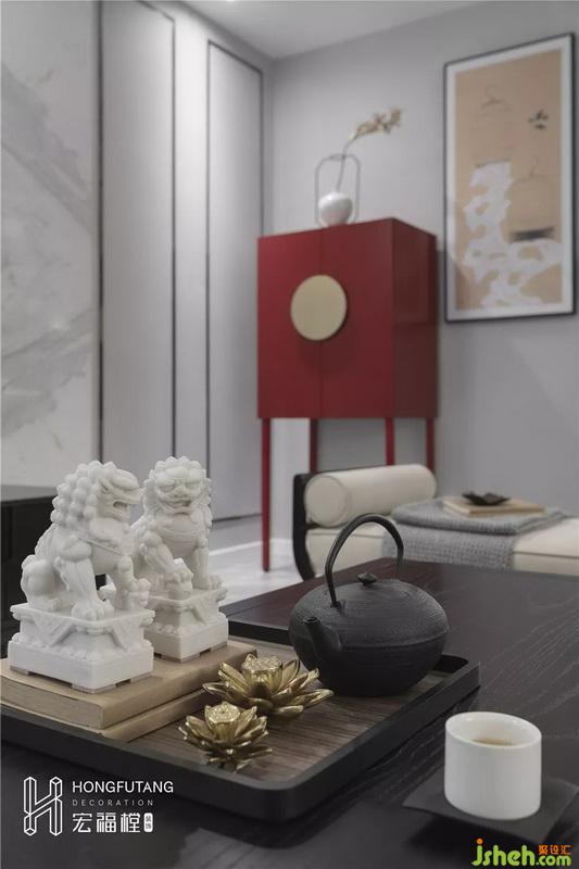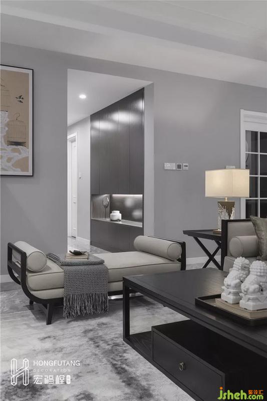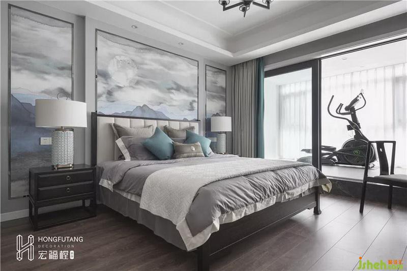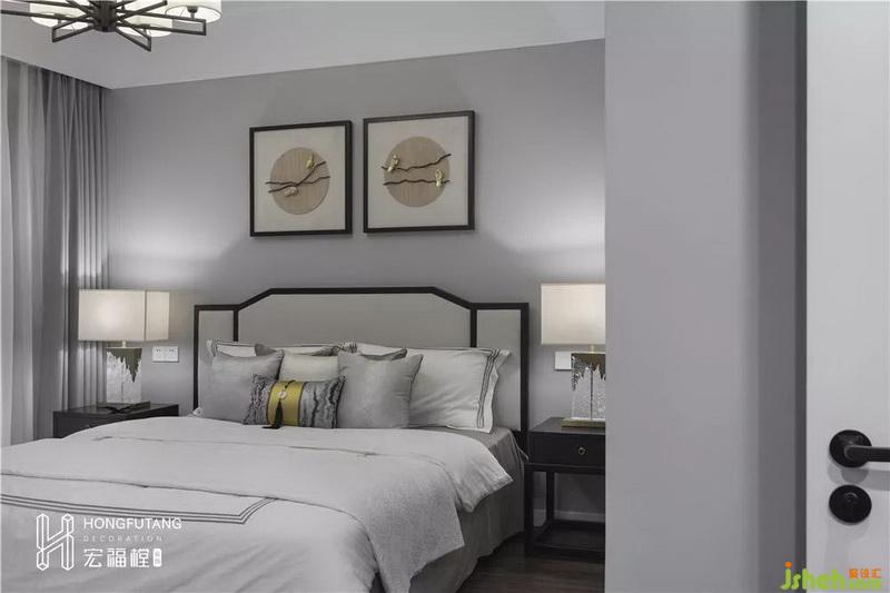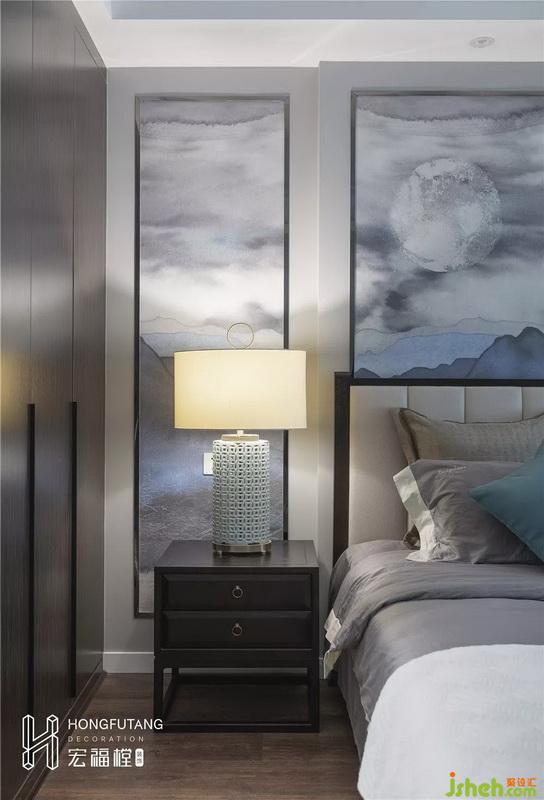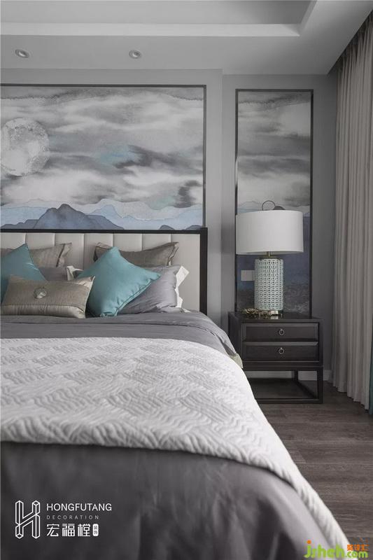 主卧吊顶设计使得视觉空间更加开阔,延续高级灰主色调,选用天水碧和沙青两种中式色彩作为软装调和单色带来的孤独感;家具摆件线条明朗纹理清晰,体现中式风格的内敛、庄严、优雅、质朴,直线装饰线条体现现代人追求简单生活的居住氛围,更迎合了现代气息,卧室空间更加实用,富有现代色彩;床头背景采用丝绸定制墙画,比山水画更加温柔,提高空间质感。
