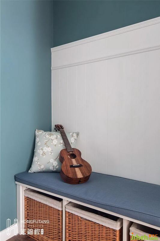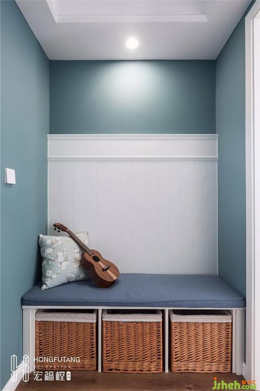 入户空间相对独立,在入户门厅增添换鞋挂衣区,便于空间收纳,靠墙位置用白色木板,减少墙体接触的污染,也综合局部的深灰绿,让人有一回到家便放松下来的归属感。