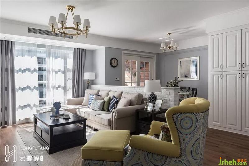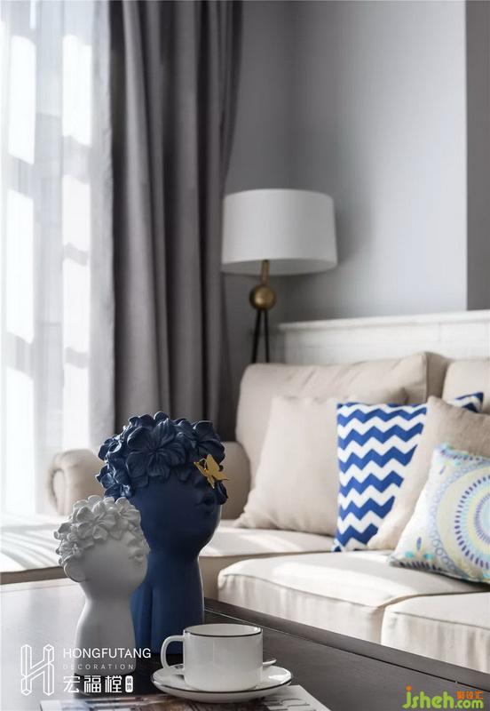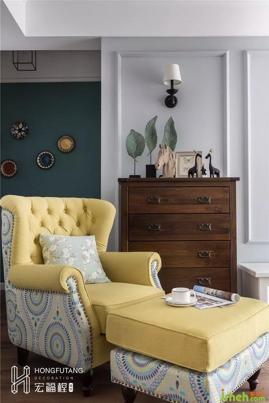 客厅颜色选用低明度灰蓝色,符合业主要求,色彩简单明丽,选用柠檬黄单人沙发,蓝白抱枕,增添空间活力;电视墙设计选用凹凸线条,丰富墙面层次,充盈视觉;客厅空间收纳主要依靠电视柜和斗柜,增添收纳空间同时也可作为摆件展示区,深浅搭配沉淀空间颜色,避免从视觉感官过于清淡,没有重心。