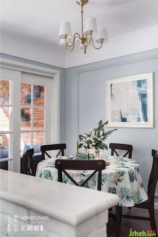 原本户型中客厅与餐厅在同一区域,两个功能区在一个空间内会互相影响,平面布局也会显得杂乱,所以客厅位置建立沙发矮墙。沙发矮墙的建立,既可有效分隔两个空间,又保证了沙发背后的稳固性,也提供了电源的位置预留,用餐时还能作为岛台使用,放置餐食。
