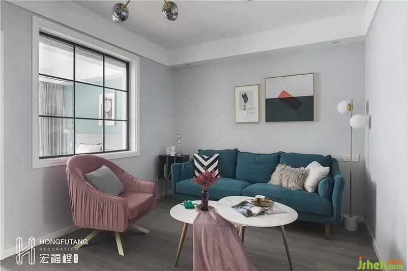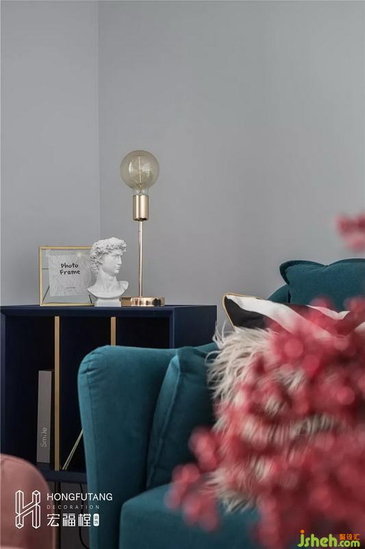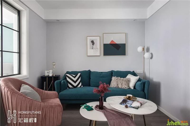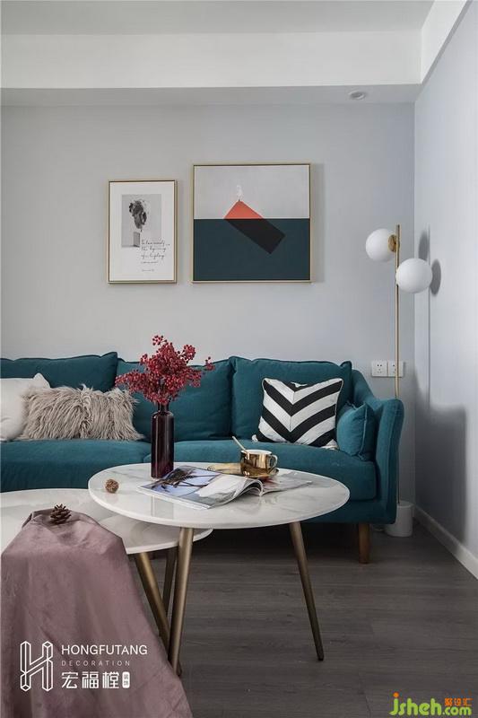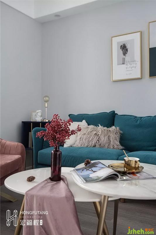 沙发选用宝蓝色搭配皮粉色,布艺材质使得空间更加温柔;利用客厅墙角位置摆放边几柜,增加空间收纳,客厅视觉丰满;两个圆形茶几搭配,柔化空间方正感和棱角,也不会占用太多空间。