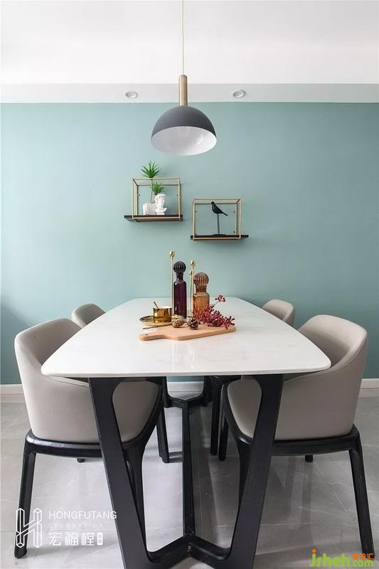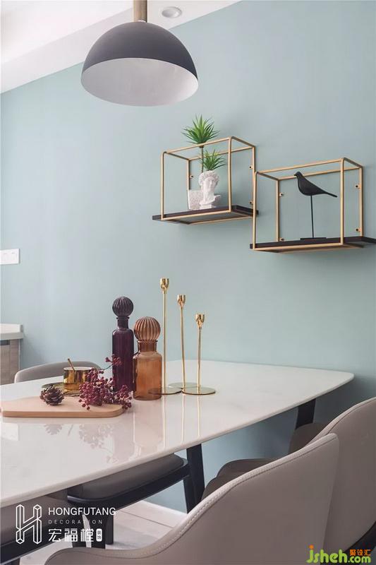 餐厅与客厅处于统一空间内,空间开阔明亮。原始结构中餐厅与主卧之间存在88cm的门洞,为了合理划分使用空间,封闭门洞。