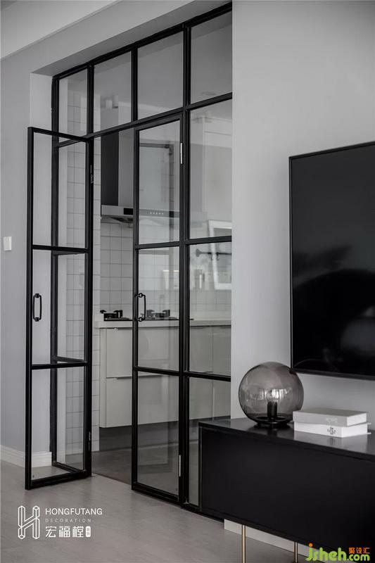 厨房本身较小,无法容纳下双开冰箱,所以将厨房与卫生间墙壁拆除,将原本洗手台位置用来放置冰箱;厨房门与电视墙在同一个墙体上,电视墙门面过多,加之为了改进厨房采光,厨房门换成黑框玻璃门样式,丰富了电视墙面,增添了厨房光亮,改后扩大了内外的视觉空间,并且从竖向面上达到了分区的作用。