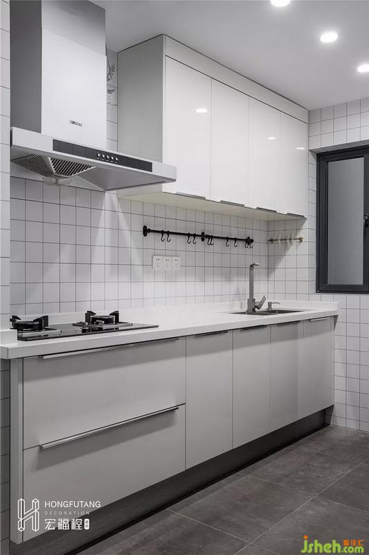 厨房内选用网红格子砖,简单素雅,线条纹路使得厨房空间更加整洁。