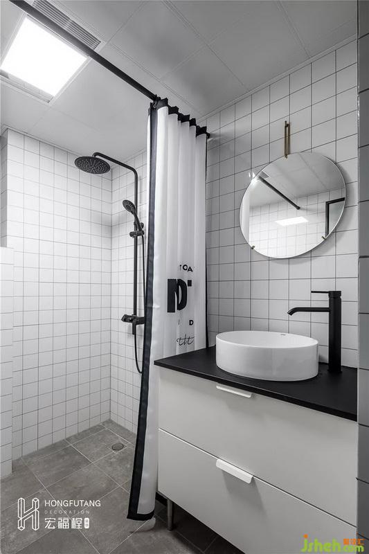 卫生间延续厨房风格,黑白灰三色组合,空间干净整洁;采用浴帘将卫生间干湿分离,不影响使用同时,也减少隔断对卫生间空间占用。