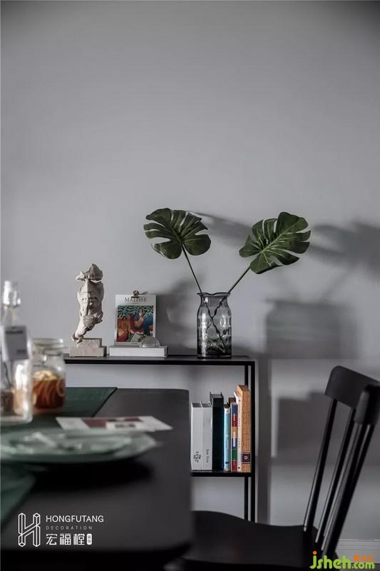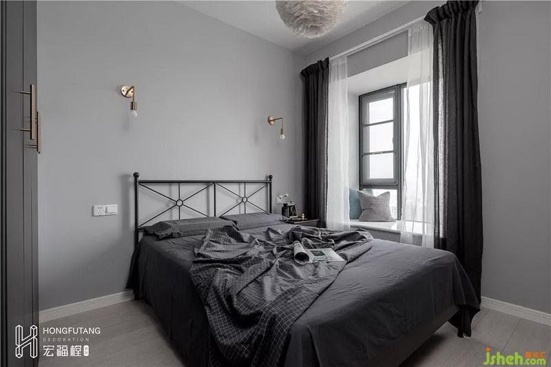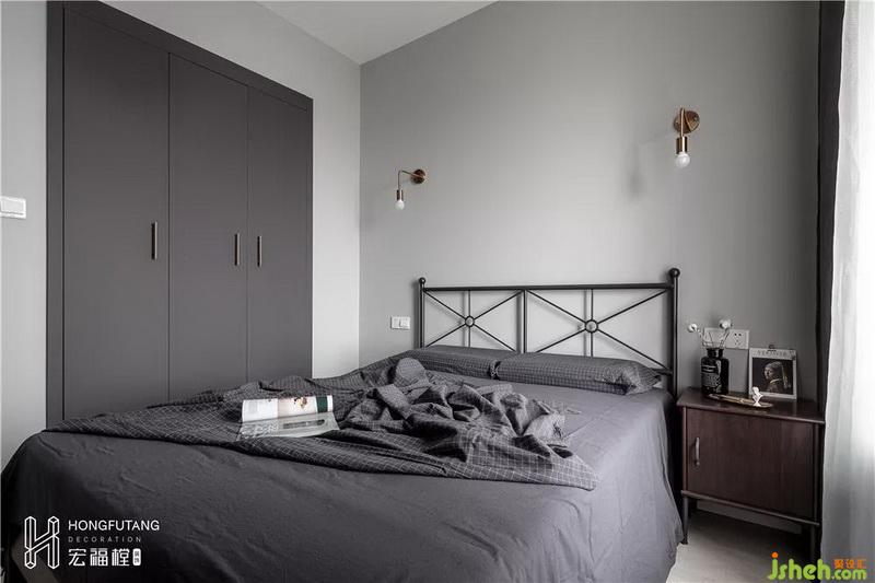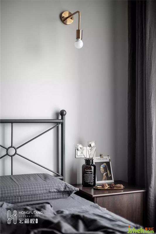 在家具选用上,选用灰黑色保证空间统一风格,铁质床占用面积小,风格清新简洁,选用主灯搭配床头灯,床头灯设计可以补充光源,增添氛围灯光,也便于睡前开关。