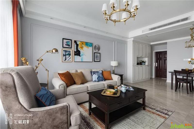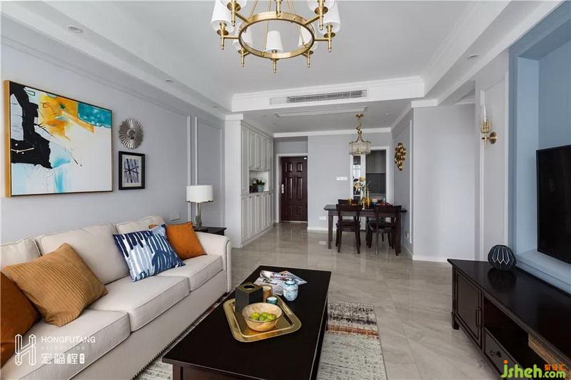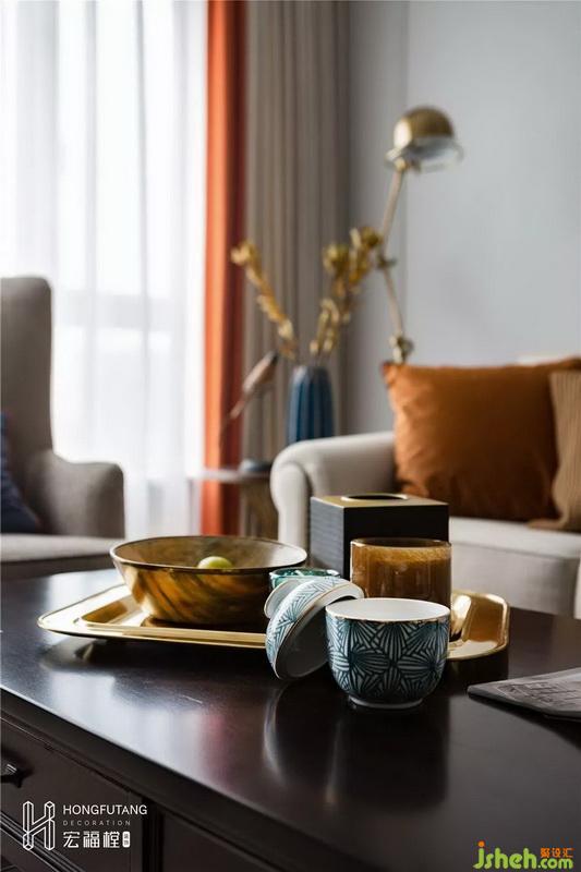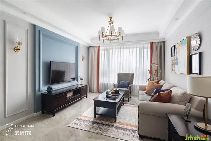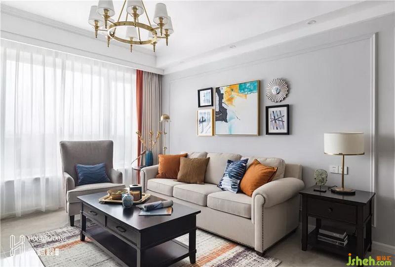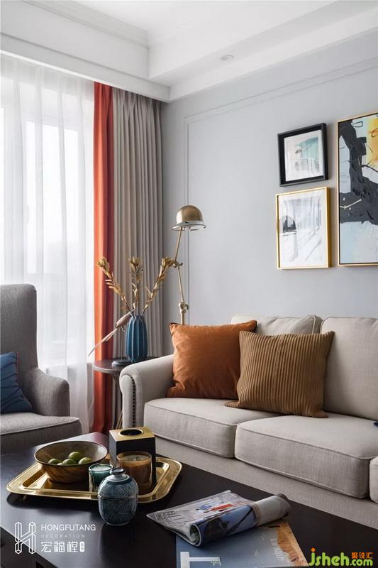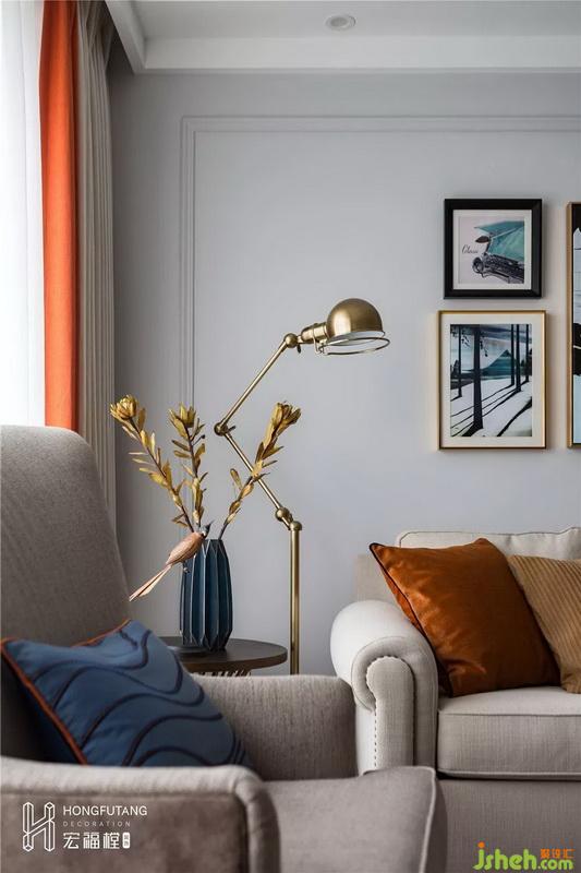 美式客厅风格简洁明快,色调靓丽,加之业主年轻化,在选用色彩搭配时,设计师没有选择沉闷的米金咖搭配,选用灰蓝色作为电视墙背景,低明度色彩提升空间高级感;南瓜色选用在窗帘位置、抱枕、壁画、地毯小面积出现,增添空间活力,提高色彩明亮度的同时,也不会喧夺空间的整体风格。