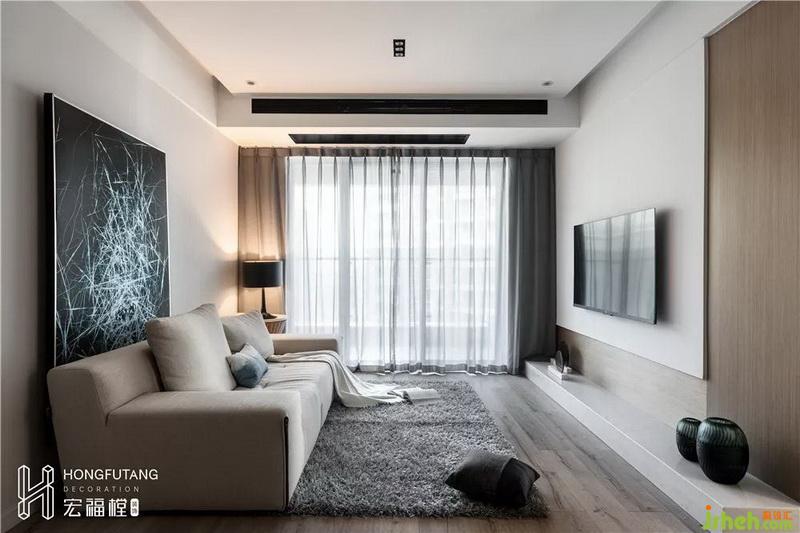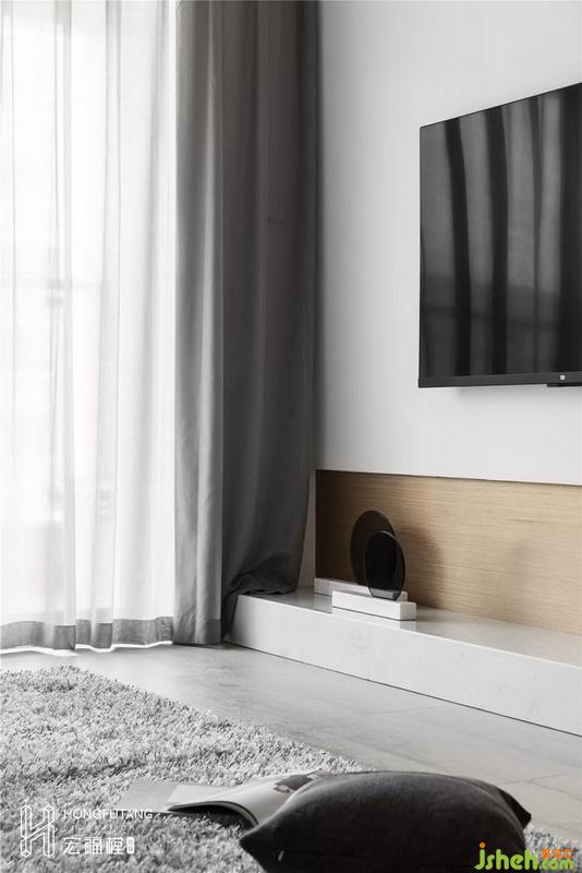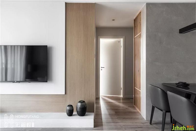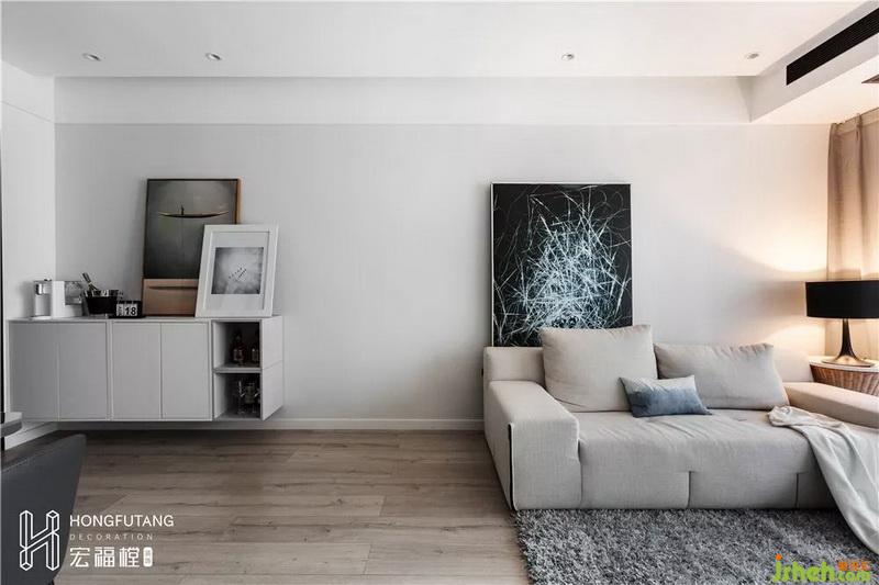 业主想有一个户外活动空间,休闲阳台依然保留。客厅空间有限,所以没有采用茶几,用地毯和沙发延伸客厅空间,地毯的使用使得冰冷的地板有了温暖,可容纳业主二人平时看电视,打游戏,在朋友来时,也可直接席地而坐,减少多余凳子对空间占用;电视墙选用白色墙壁搭配木色底板,本身整个客厅选用白色墙壁,颜色单薄,搭配木色包边做成凹凸状,使得空间层次感更强;选用底台设计,减少电视柜对空间的占用,视觉上空间更加干净;沙发墙选用大篇幅的深蓝色系画作,统一空间色系,也避免了墙面的空白感.