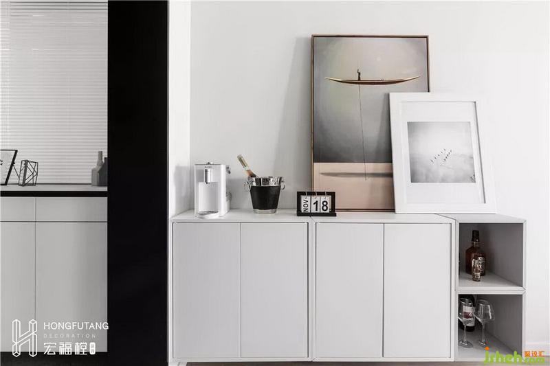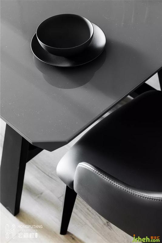 餐厅选用深灰家具搭配左侧青灰墙面,灰色的运用提高了餐厅空间质感,现代感更加强烈。餐桌对面设计悬空挂式壁柜,上方可作为陈列区和小家电使用区,左边封闭柜子作为收纳区,右边两格作为酒具放置区,采用这样半封闭的样式,避免了视觉呆板。