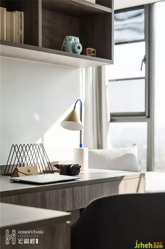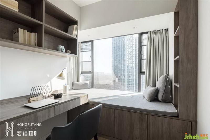 书房飘窗加宽,采用榻榻米形式,右侧设立半封闭收纳柜,可作为摆件的放置区,榻榻米下方也有足够的收纳空间放置不常用物品,使得空间更加整洁;榻榻米的采用一是可作为业主偶尔工作放松区域、阅读区,二是可以用作客人留宿使用。