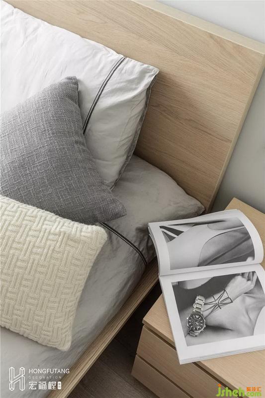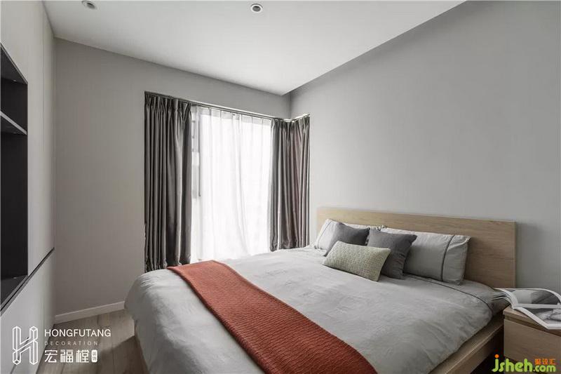 主卧空间低调柔和的配色与木质家具,营造休息空间的简净高尚。无色调的空间搭配有色调的姜橙色床毯,打破了空间的单调感,为主卧增添了更多的温馨舒适感。