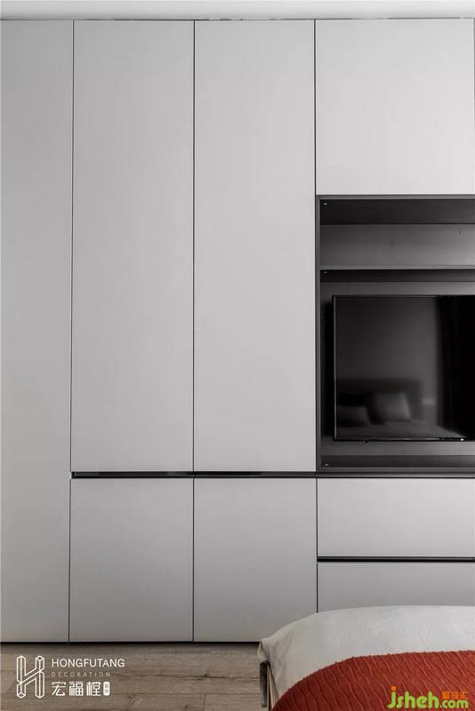 业主希望能躺在卧室床上,用大大的电视看着肥皂剧享受睡前的时光,加之女主人希望的收纳空间,设计师将衣柜和电视墙融入一体,将电视嵌入衣柜内,最大限度扩大了卧室的收纳空间,也为电视留出一席之地,衣柜在此运用,也减少了电视墙的打造工序。