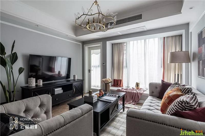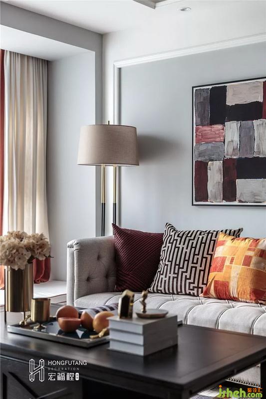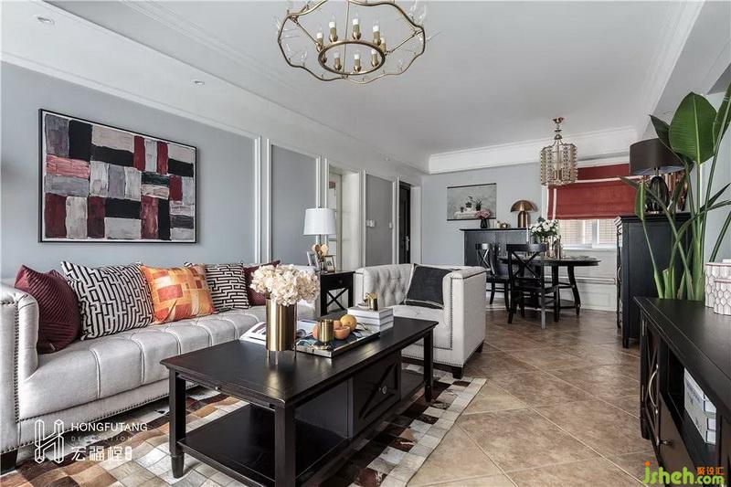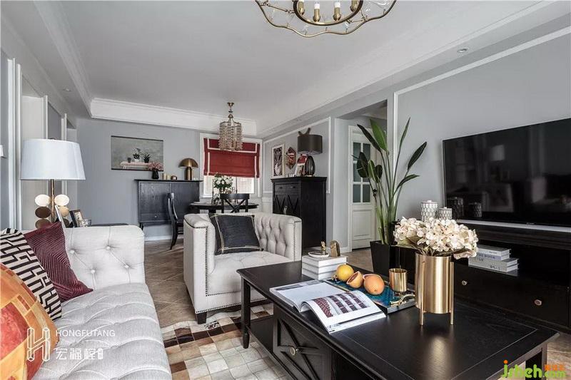 客厅装修以灰黄搭配,美式风格的典型代表,选用黑色家具稳住空间颜色,软装采用红、橙、棕色来搭配客厅空间,暖色系的使用使得整个空间更加愉悦、温暖。