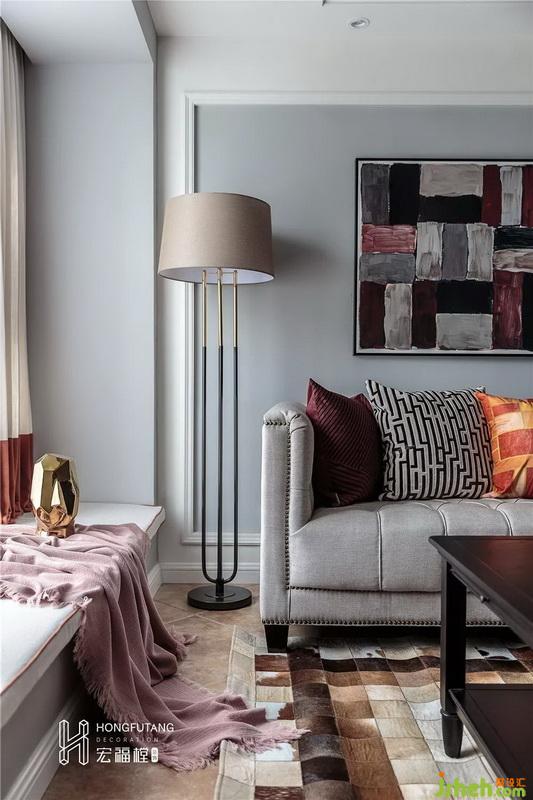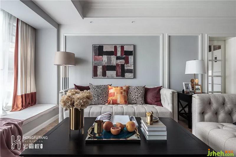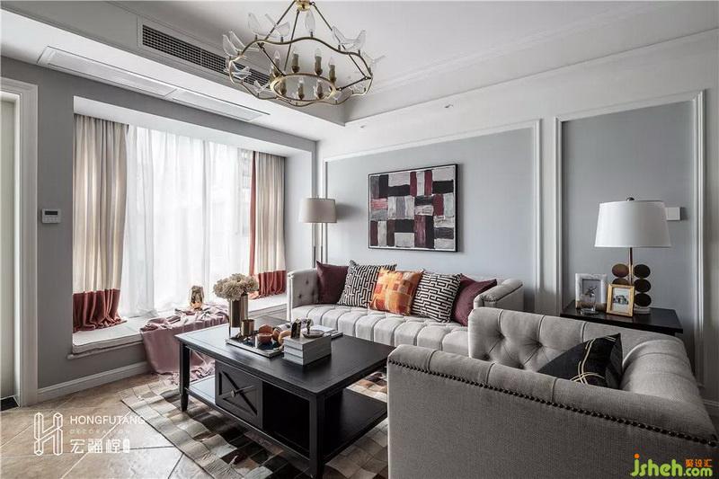 客厅面积有限,选用的家具相对占空间都不小,所以在客厅搭配上没有选用过多的装饰,而是采用色彩搭配来使得空间更加灵动;墙壁选用线条将灰白分界,使得整个墙面空间显得更加立体,层次感更强;壁画、地毯、抱枕选用格子元素,能从视觉上饱满单色的感官度,同时因格子本身的时尚气质,提升整个家居品味,中和美式风格的奢华,给人一种略带俏皮的感觉。