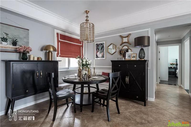 餐厅面积较大,考虑到常驻人口少和使用频率相对较低,设计公司没有选用过大的餐桌椅。选取餐厅窗台一角做成转角卡座形式,卡座的设置可容纳多人,这样的设计能减少餐椅对空间的占用,临窗而设用餐区光线更加明朗,提高用餐体验;还有未使用的餐厅空间,摆放两个斗柜,一是能作为空间陈设使用,二是增加收纳空间,用作物品收到和摆件展示区,合理利用餐厅空间,加之配以墙上装饰,将餐厅打造成用餐、美学展示集合区,选用红色窗帘作为整个空间软装主色,活跃空间,别有美式风情。