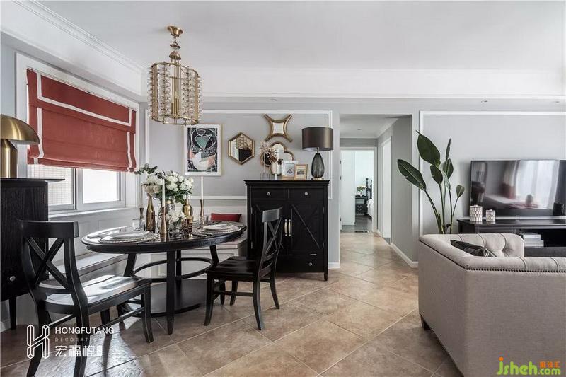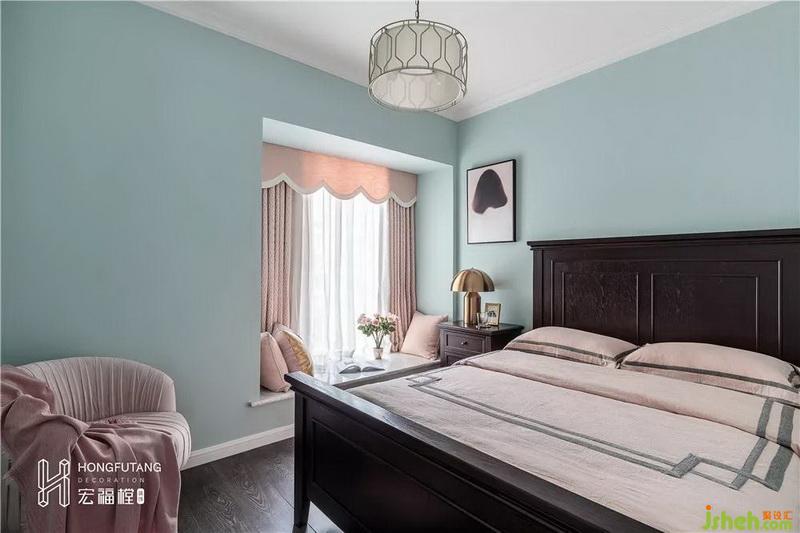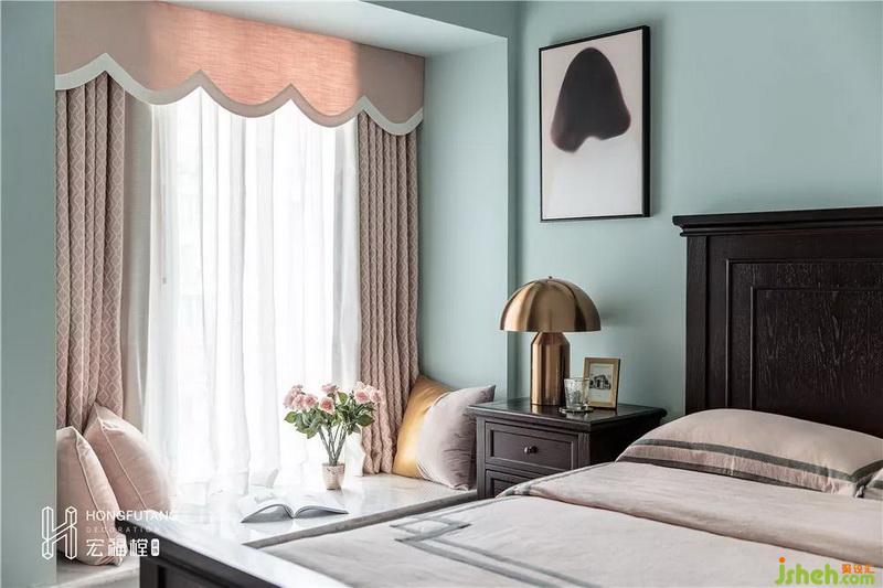 次卧选用主卧同款风格,唯一不同是,次卧大多时候用作父母或接待亲友,在颜色的运用上,选用粉色更加柔和,比起主卧的温文尔雅,次卧更加娴静平和。