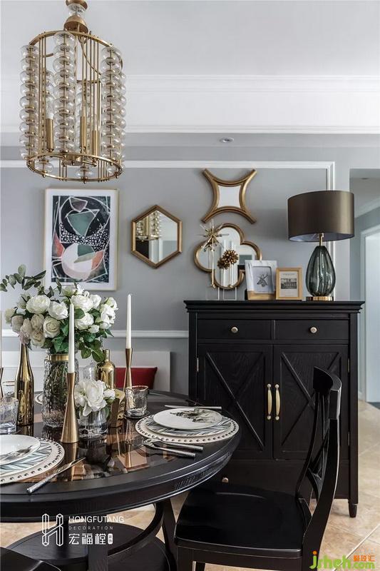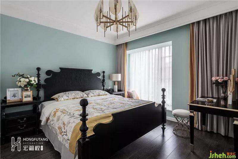 主卧风格与书房风格一致,延续书房的色彩印象,在软装上选用金属色装饰,细节处精致考究,打造空间温情的氛围。为符合业主本身气质,没有选用过于明亮的颜色,而是在窗帘、摆件等细微处用暖色系来营造空间氛围。