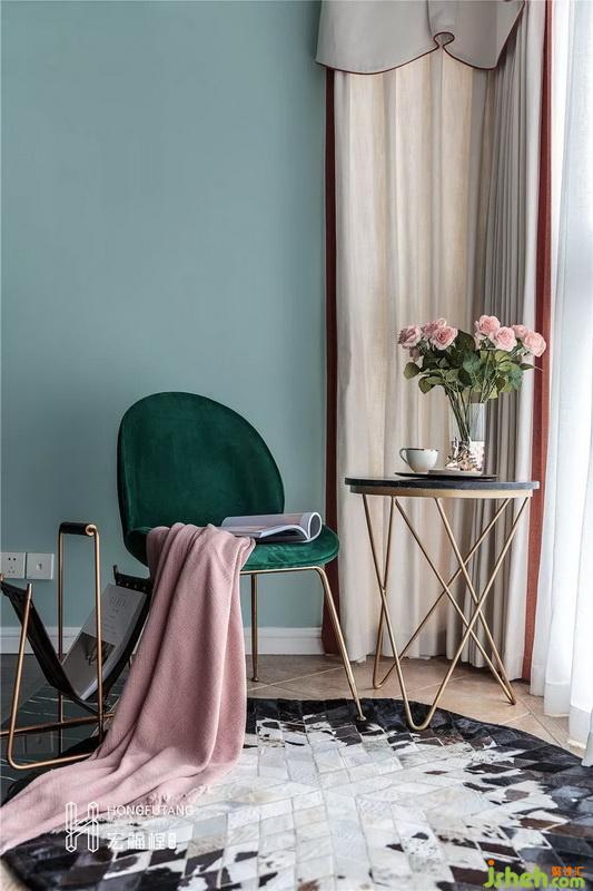 原始户型中书房一角为空调外机放置阳台,考虑到这样的设计会使得书房空间出现缺角,空间不方正,无法最大利用空间,所以将外置阳台融入书房之中,将此处作为业主休闲阅读角落,选用墨绿色座椅搭配浅色空间,空间环境清静不失灵动。