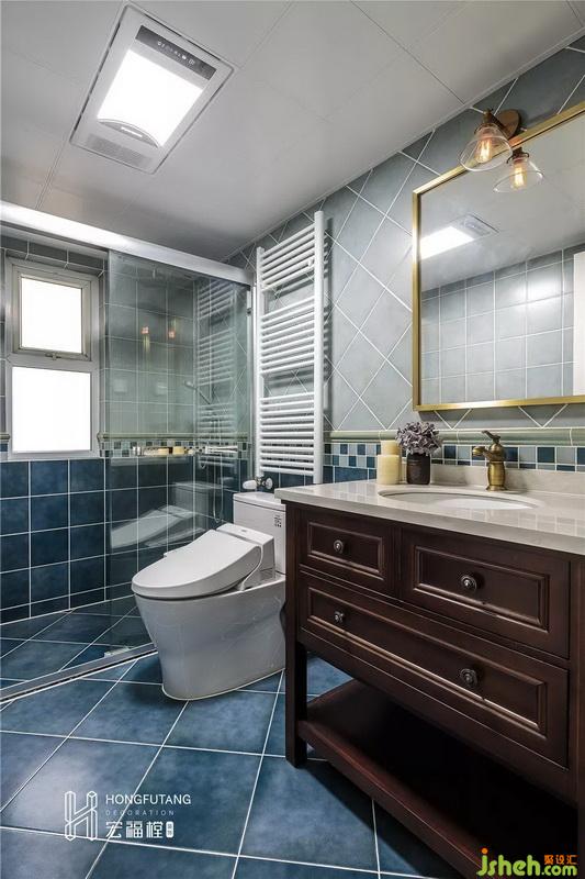 卫生间设立淋浴间,干湿分离,便于清洁的同时,减少空间热量流失;选用深浅不同的蓝色瓷砖打造渐变的空间,使得空间墙面更丰富;洗手台上面做成收纳抽屉,能够把有限的空间,充沛的使用起来,有更多收纳的空间,也能够确保洗手台面坚持整齐,下面做成置物架,可以藏匿不常用大件浴室用具。