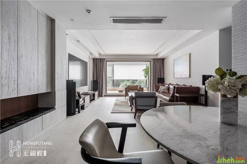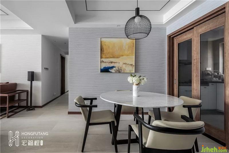 餐厅选用客厅同款吊顶,与走廊空间平顶不同,自然分割功能区。