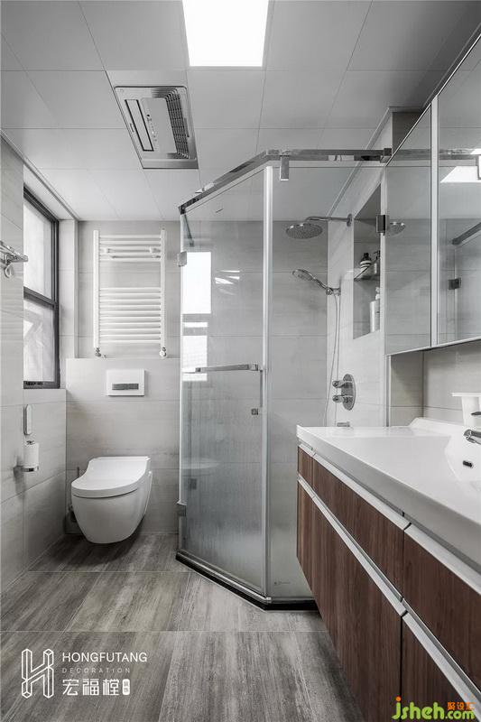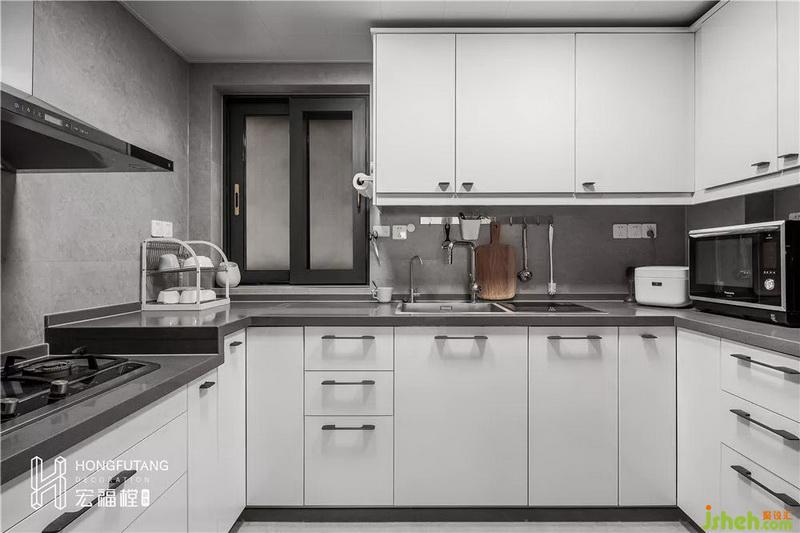 厨房是家中最有生活气息的地方,柴米油盐在这里相遇,烹饪了家的味道。在旧房中,厨房可通往洗衣房,考虑到实际使用时的问题,设计师与业主商议,将厨房到洗衣房的入口封起来,取消掉一条鸡肋的动线,厨房可以多增加1m的操作空间,同时在洗衣房又可以开辟出一块宠物休息区橱柜多留出1m的距离,厨房三面都可以设立橱柜,满足了厨房使用的日常需求;在橱柜设计时,左侧操作台面考虑高低层次,为也业主带来更舒适的操作空间;厨房选用灰白搭配,与客厅色调一致,灰色墙面更耐脏。