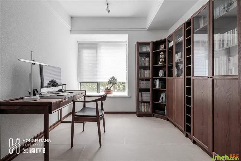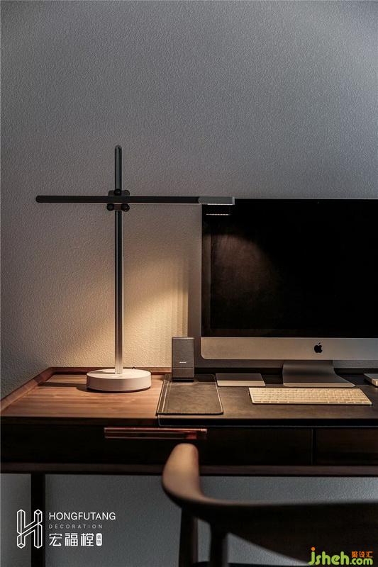 业主藏书量大,右侧选用上透明下封闭的书柜,刚好容纳业主的书籍;左侧设立书桌,选用胡桃木颜色配合客厅空间风格,台灯的选用是业主喜好的新奇电子产品类型;百叶帘在书房使用能够合理的控制书房光线。