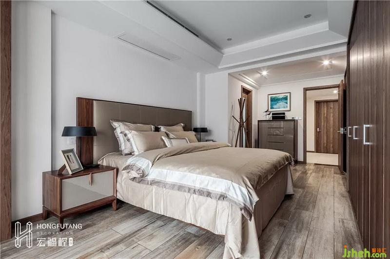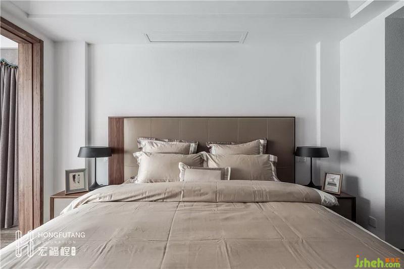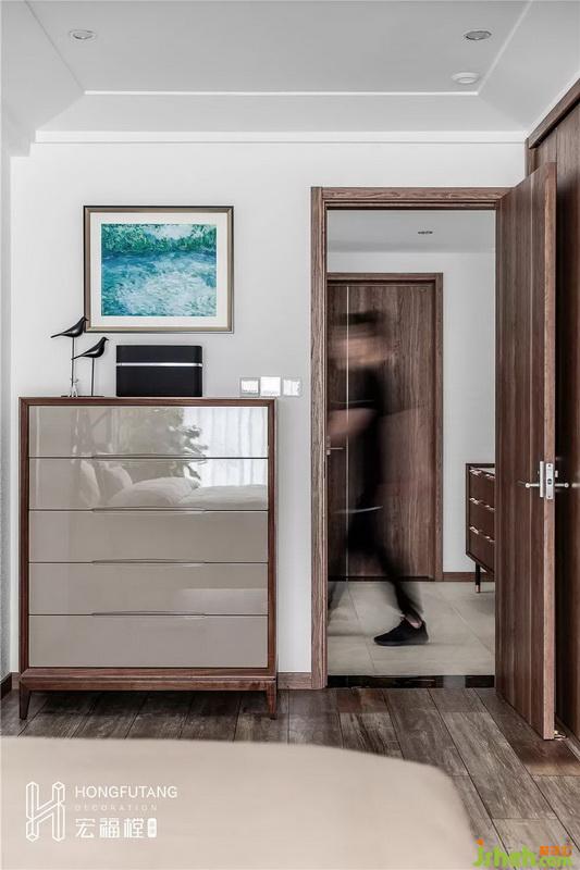 主卧门洞往左平移60cm后,原本只能容纳1.9m长的衣柜,改动后可容纳5.7m长衣柜,收纳空间扩大三倍。主卧吊顶采用斜面设计,通过渐变的方法使空间平缓过渡,解决主卧室到主卫生间之间60cm的大梁对空间造成的压迫感,视觉上空间“更高”,更有层次感;主卧室门洞的位置调整,向左平移60cm,为主卧衣柜留出空间,使得整个衣柜可以拉通靠墙摆放,增加了收纳空间;靠门左侧设立斗柜,可以摆放物件和收纳小件物品,方便分类,略微遗憾的是斗柜上面的灯光位置没有充分考虑,灯光效果有所减弱。