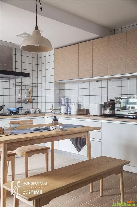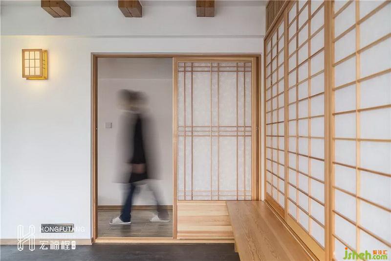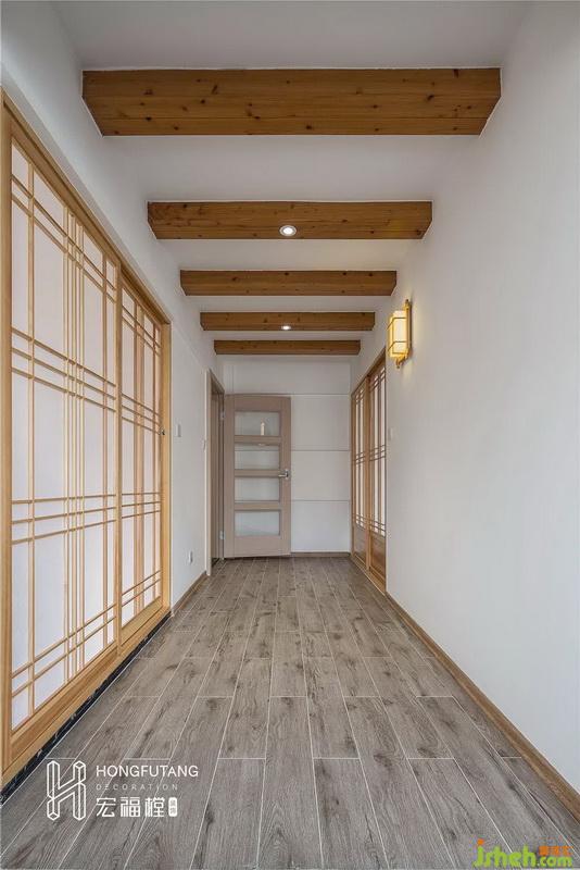 几个房间用日式木质推拉门分割,推拉门设计,木质搭配磨砂玻璃材质,利于空间采光;走廊设立假梁样式,加强空间层次感。