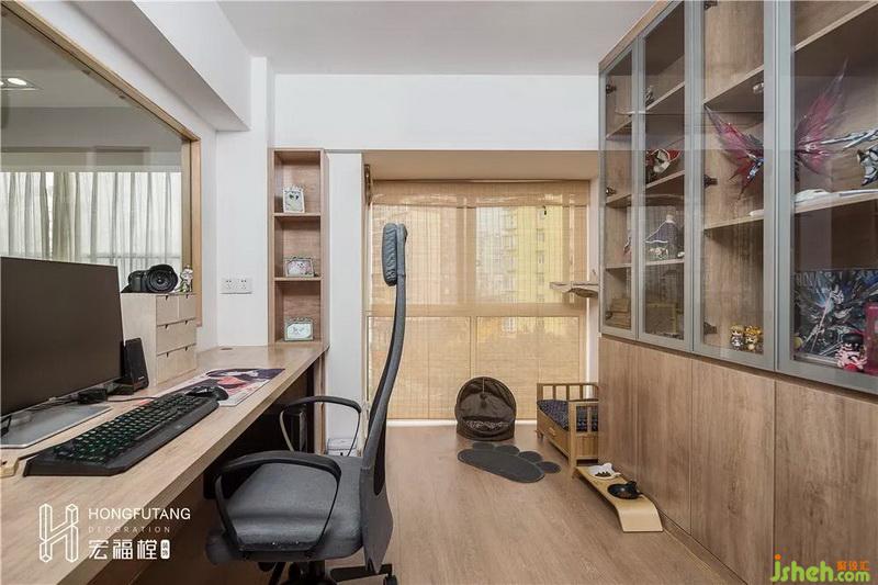 书房是由二楼公共区域隔出,书房和客厅采用半高玻璃分割,空间更加通透且利于书房采光;书柜采用上方橱窗式,陈列主人收藏的各种手办,下方做成封闭式收纳柜,增添隐藏收纳空间;书桌可容纳两人共同办公,书桌靠窗户尽头做成壁龛,用于陈列爱宠的照片;书柜与墙壁处则规划为布偶猫的休憩处,忙碌之余,还可以照看这个小家伙。