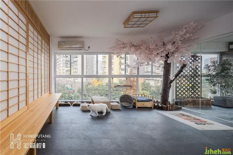 室内的樱花树、矮茶台,猫舍也是与猫猫亲近的最佳处。
