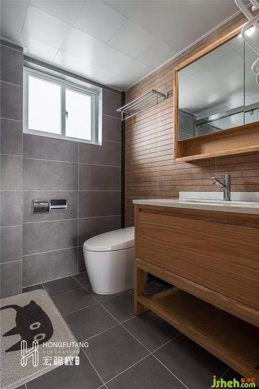 次卫生间面积扩大至6.1㎡,可增添独立淋浴间,选用仿青水泥砖搭配木质洗漱台,符合空间风格。