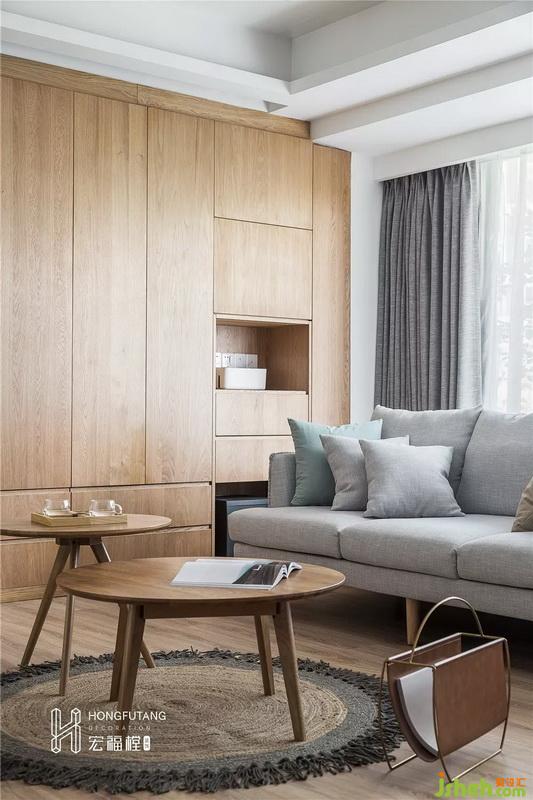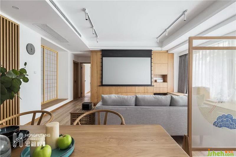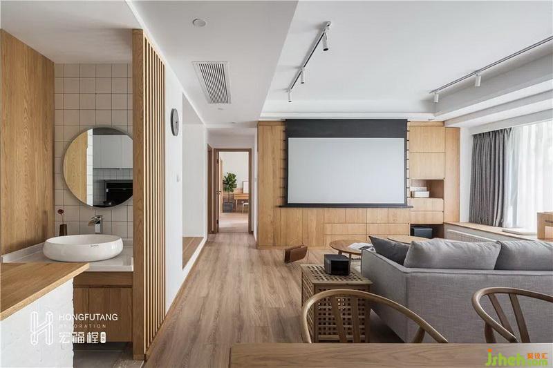 横厅室内设计师采用吊顶设计,使得整个空间组合看起来更大。客厅背景墙采用原木木板材质,搭配投影屏幕,选用这样的设计有两个好处。一是在屏幕收起时,避免大白墙带来的空白感,二是选用木板搭建半封闭半开放的收纳空间,封闭空间作为不常用物品收纳区,开放空间作为书籍、摆件展示区。这样的设计层次分明,避免满柜带来的呆板,也减少了清洁的难度,增添了收纳空间。
