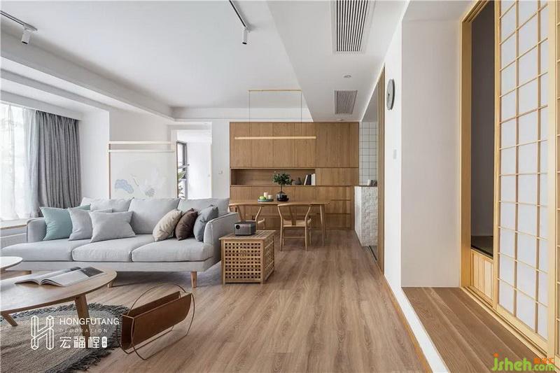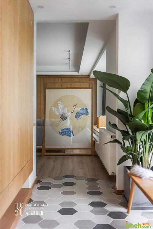 为避免从玄关处一眼望尽,在玄关处设立和风屏风,符合整个空间的日式气息;玄关处和餐厅利用不同地面材质区分功能空间。