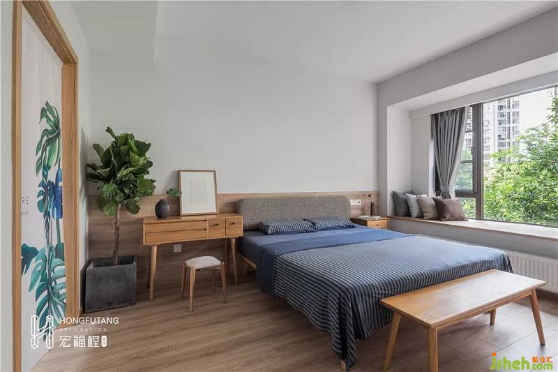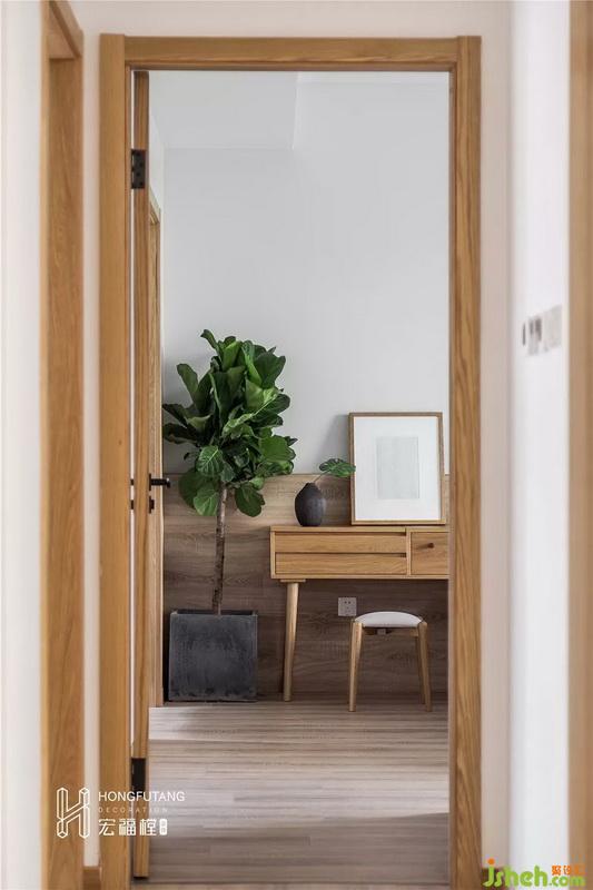 主卧墙面设计采用上墙下板的形式,墙面上半部分选用白墙,根据床头高度,选用木地板铺墙面,这样设计的理由,一是增添白墙的层次感,避免大面积的空白;二是,减少家具摆设靠墙对墙面的损伤和破坏。考虑到主卧空间有限,选用简单的原木桌作为业主化妆整理区域,床尾放置春凳可作为日常衣物摆放区域。左侧衣柜门选用龟背竹作为背景图,原木色与青绿色的运用,打造日式与北欧风格混搭的休息空间。