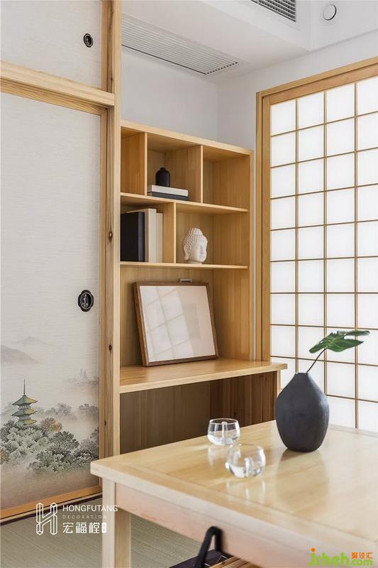 3、可以直接睡在榻榻米上,撤掉被褥后可以腾出很多空间,设立收纳空间。左侧作为衣柜使用,右侧作为书籍收纳摆放区。