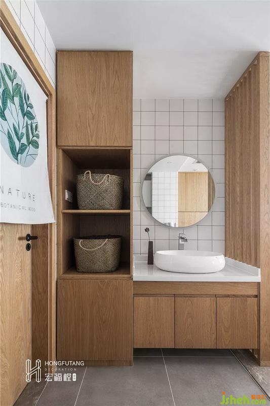 在动工之初厨房和次卫生间相通,现将卫生间隔断拆除,借用生活阳台部分作为卫生间使用空间,用门分离次卫和洗漱台。洗漱台墙砖采用与厨房统一风格马赛克小瓷砖,左侧设立收纳柜,可放置日常洗漱用品,竹篮可作为日常换洗衣服放置空间,便于统一清洁;右侧用原木栅栏作为隔断,起到分区作用,避免从客厅一眼望穿,保证洗漱空间一定的私密性,也不影响空间通透感。门帘选用北欧植物,在此也是日式与北欧风格融合的体现。
