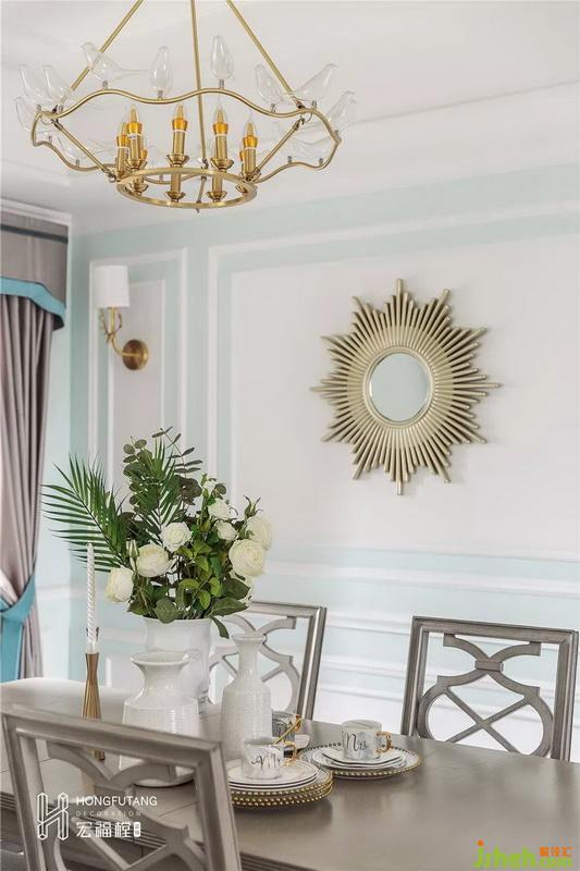 整个空间依靠右侧采光,所以在灯光考虑上,客厅、餐厅各一个主灯,客厅边几选用落地灯,可在此处随手阅读书籍、杂志,客厅电视墙一组壁灯更多作为装饰使用;装饰类摆件大多选用金属色,金属色摆件贵气优雅,符合法式浪漫轻奢风格,也是业主需求的体现。