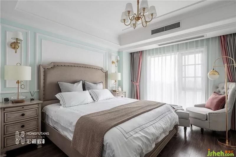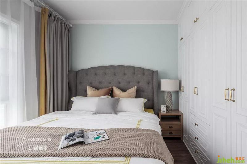 选用棕色家具,调和淡色空间,使得空间层次感更强,软包床头,符合人体舒适度;为了增加收纳面积,所选用的床头柜、斗柜都有大量收纳的功能;床边摆放沙发凳,可作为小憩和睡前阅读的空间。