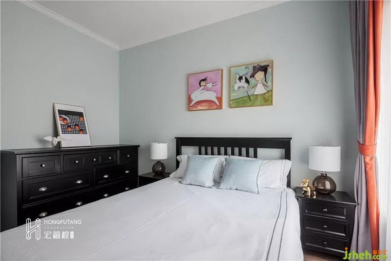 室内设计师考虑到儿童房氛围,没用过多的装饰,采用两幅色彩鲜明的画作作为墙面装饰,平衡空间重心;与其他空间一致,采用多收纳功能的家具,儿童房取消了衣柜设置,用斗柜达到收纳效果。