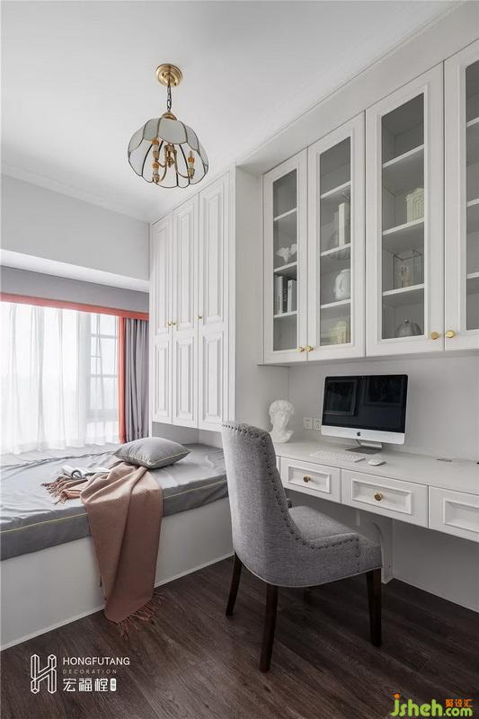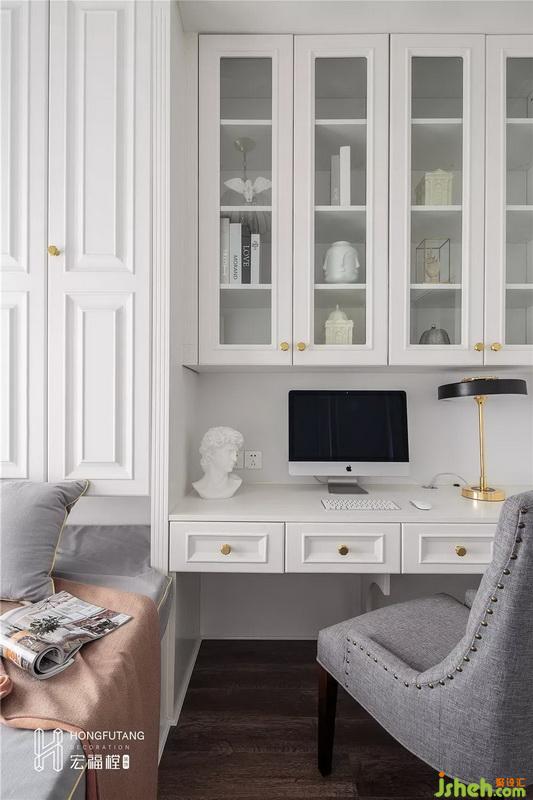 书房室内设计师选用一体式家具,利用家具的自然线条,将每个功能区进行明确的分隔。书房靠窗位置,室内设计师采用榻榻米样式,一是可以满足业主工作之余,偶尔放松小休,二能满足基本客人留宿,三是利用榻榻米靠墙空间作为收纳区,可收纳不常用大件物品。右侧上方做成书籍收纳区和摆件展示区,下方设立书桌,可满足日常办公或小孩学习的需求。整个书房成了收纳性最强的空间。