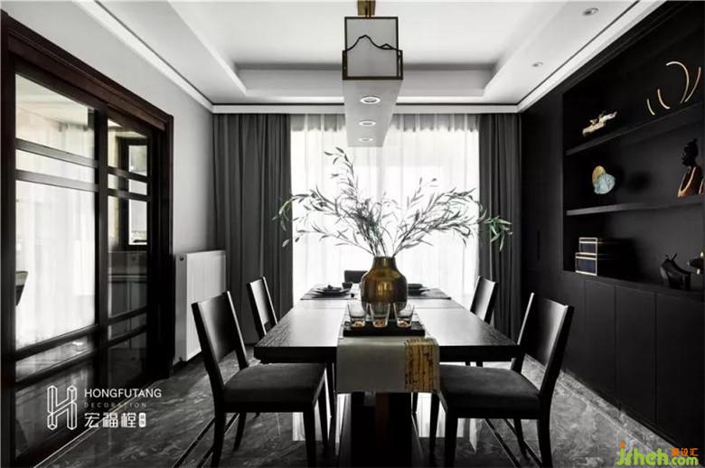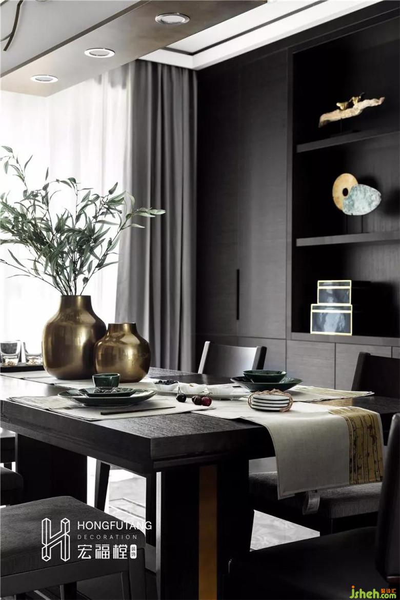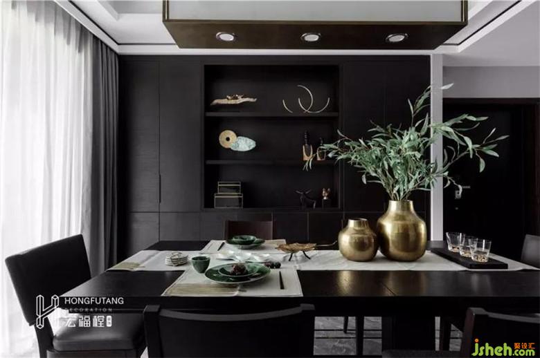 餐厅选用最简单的吊顶,黑色木质包边,搭配木质布艺灯具,线条感强烈,符合中式方正中庸的气质,也不失现代线条的简约;餐桌椅选择传统的实木,质感温和,方方正正的造型古朴亲切,每一丝细节都透露着不卑不亢的中国古风;金属饰品打破黑色家具的沉闷感,使得就餐空间更加人文化。