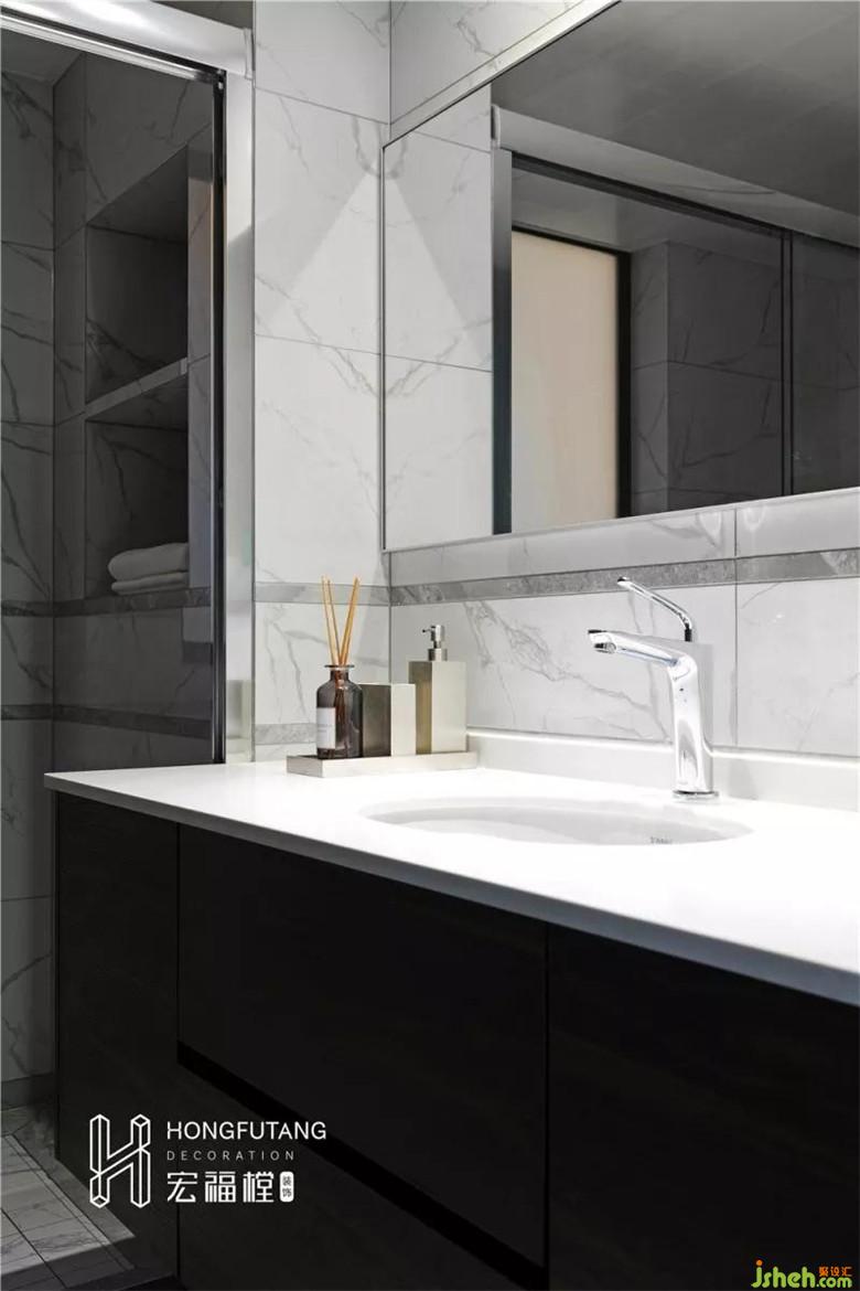 在卫生间的设计上,室内设计师追求实用性,遵循上轻下重循序渐进的原则,用简单大理石墙砖搭配白色台面,以黑色柜子作为颜色沉淀,使得空间更加稳重简洁。