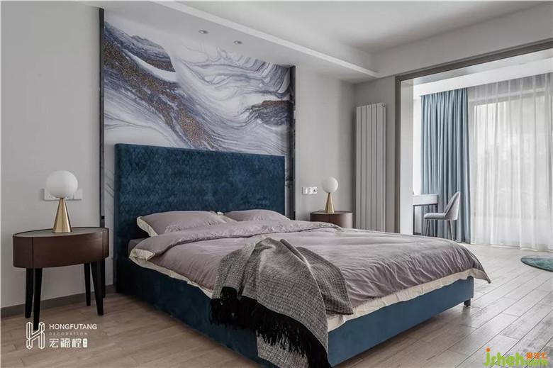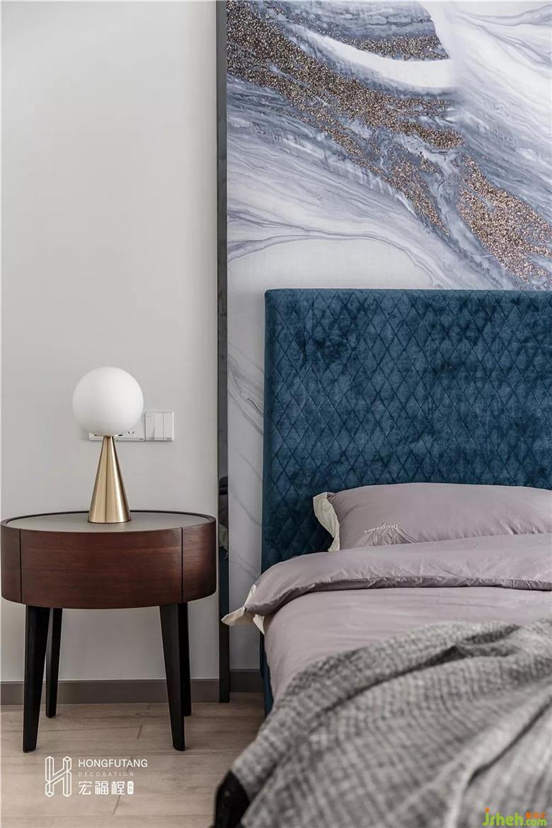 卧室空间本就是感性需求更多,主卧空间延续客厅风格,室内设计师在软装上搭配绒蓝作为整个床体的颜色,山水抽象画用作背景墙,色彩风格与整体色彩一致,卧室空间更加静谧平和。