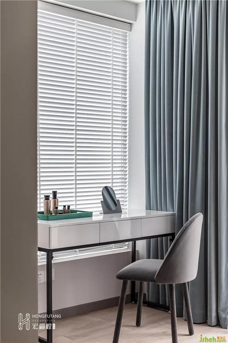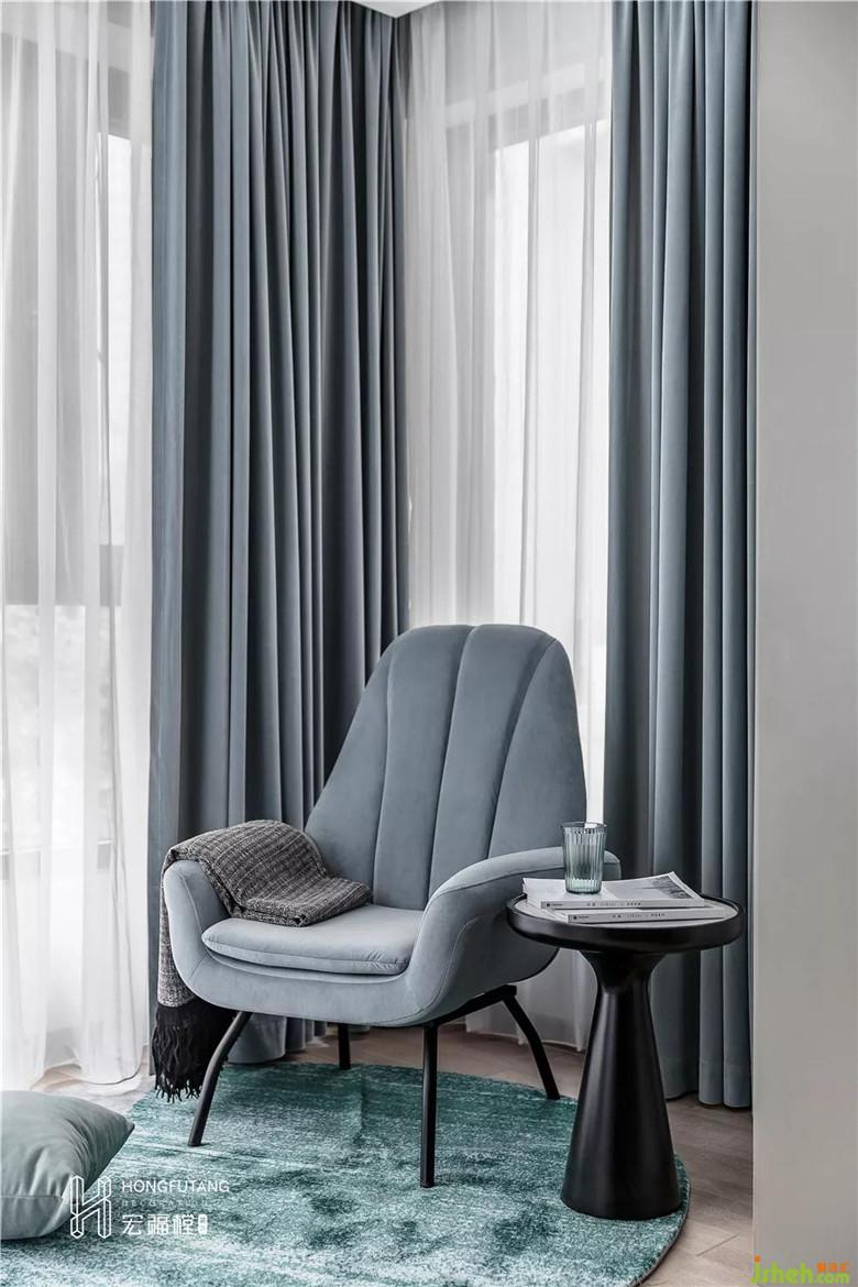 卧室阳台空间一侧作为简易梳妆台使用,一侧用作休憩看书空间使用。室内设计师选用灰绿色作为软装主色调,运用在沙发椅和窗帘上,由蓝至绿的过度,是空间由暗向明的变化,青蓝相接,将感性空间融入一丝平和向上的生命气息。