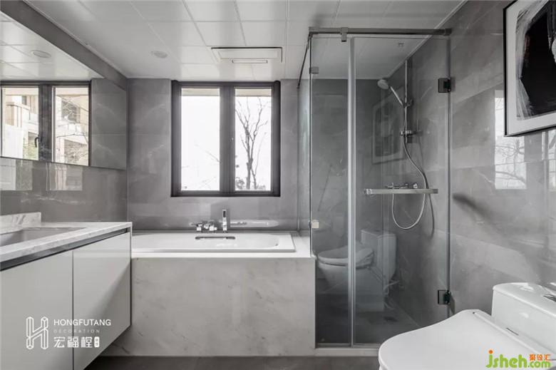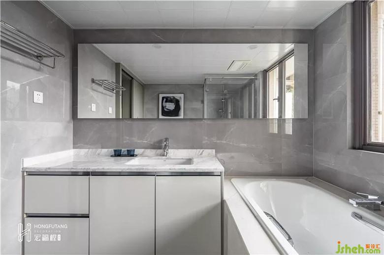在主卫有限的空间下,室内设计师满足客户需求,将浴缸和淋浴间合理排列在同一空间内;灰白大理石台面便于清洁,整洁度高。白亮光系材质光泽使空间质感提升,具有舒适与美观并存的感受。