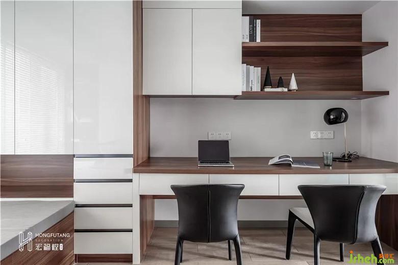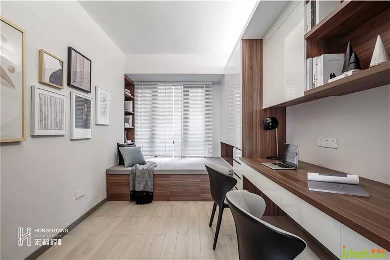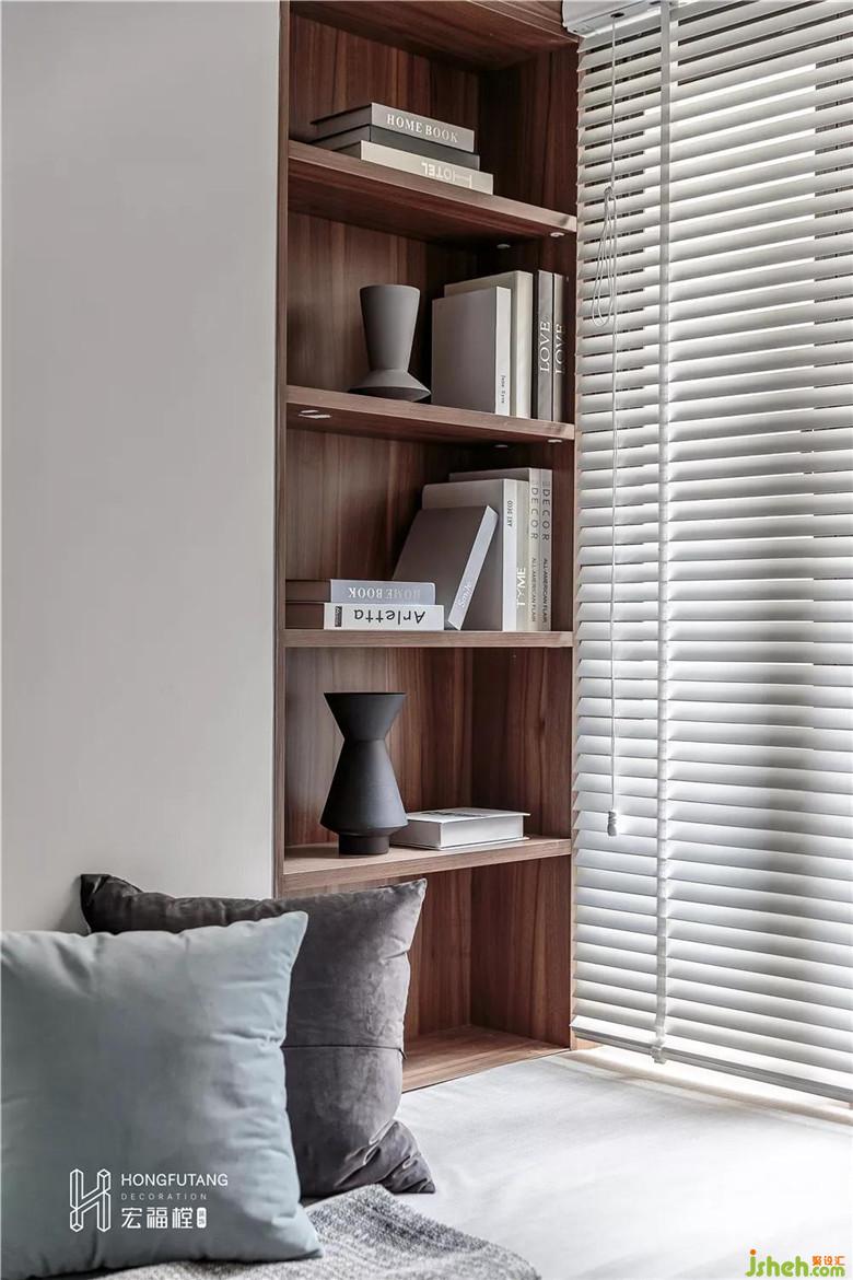 书房空间可以同时满足两人办公,室内设计师选用榻榻米设计能满足偶尔小休和客人入住,利用榻榻米两侧空间设立收纳摆件空间,将书房的功能性放大。选用木质家具,给人以温润宁静的工作氛围。