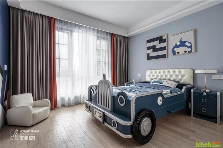 儿童房整个风格更为活泼,跳跃的橘色系的运用、独特的壁纸设计、汽车造型的床、行李箱造型的床头柜都体现了儿童房的童趣。