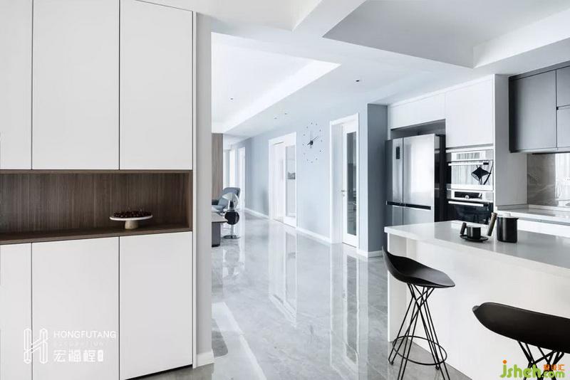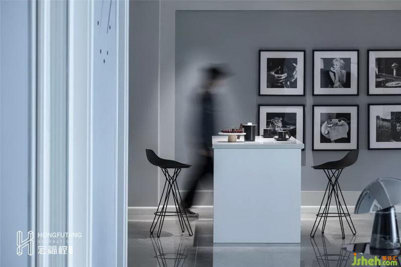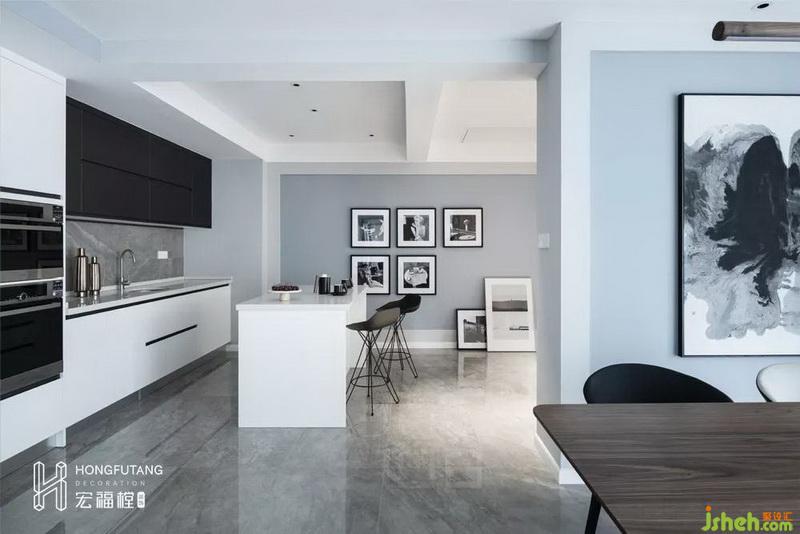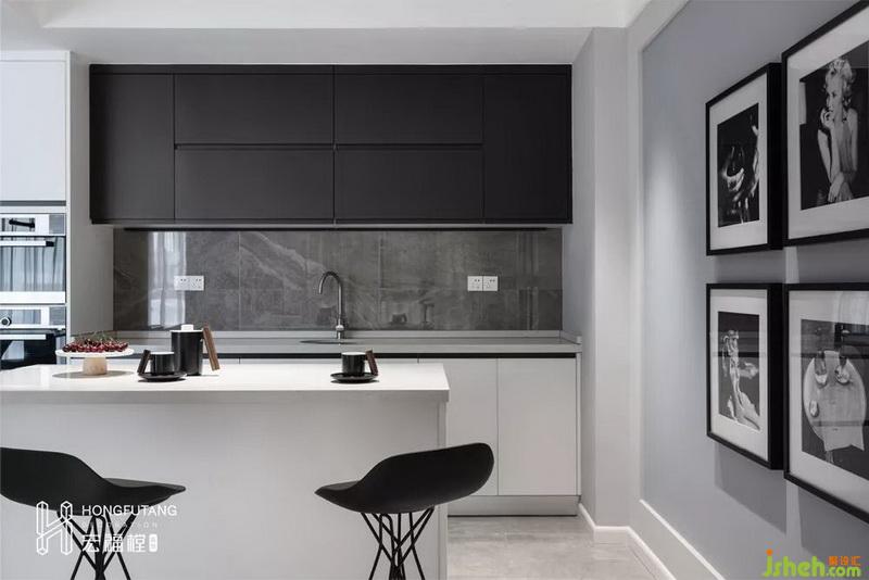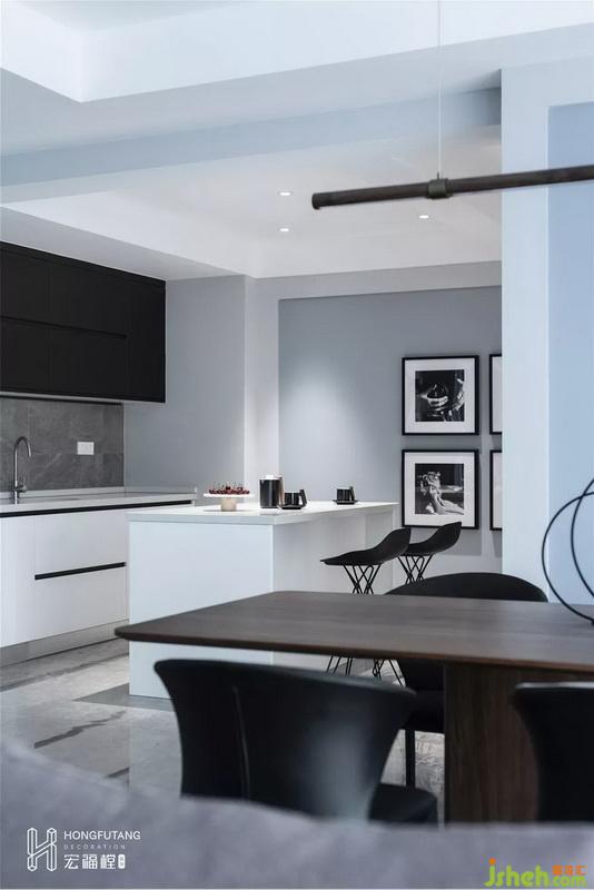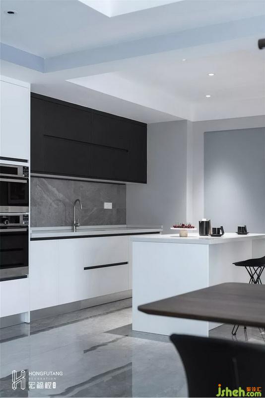 西厨区域的设置,不需要过于繁复,借黑白的色彩差异、大理石点缀,摒弃一切装饰与华丽,追求高度真实的美。